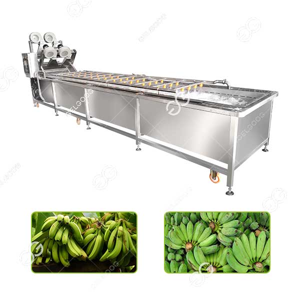- Bananas are fed into the washing tank via an elevator. The industrial banana washing machine uses a high-pressure blower or aeration pipes to generate a large number of bubbles.